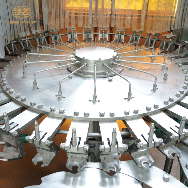 瓶子通過風(fēng)送道傳遞,然后通過撥瓶星輪傳送至三合一機(jī)的沖瓶機(jī)?;剞D(zhuǎn)盤上瓶夾夾住瓶口沿一導(dǎo)軌翻轉(zhuǎn)180°,使瓶口向下。噴嘴噴沖瓶水,對瓶子內(nèi)壁進(jìn)行沖洗。瓶子經(jīng)沖洗、瀝干后在瓶夾夾持下沿導(dǎo)軌再翻轉(zhuǎn)180°,使瓶口向上。洗凈后的瓶子通過撥瓶星輪由沖瓶機(jī)導(dǎo)出并傳送至灌裝機(jī)。